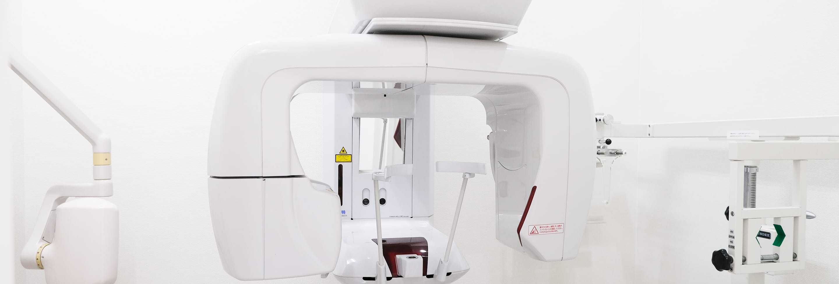 2D(平面)撮影の「デジタルパノラマレントゲン」、歯や顎の骨の状態を3D(立体)撮影が可能な「歯科用CT」、矯正歯科専用の頭部レントゲン「セファログラム」。これら3つの機能を1台で実現する装置を導入しています。特に歯科用CTは、インプラントや根管治療といった高い精度を求められる治療に欠かせない機能です。