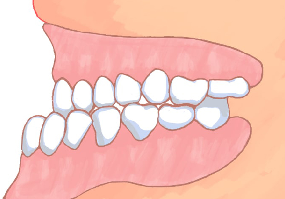 下の前歯が上の前歯より前に出ている状態で、顎関節症になりやすく、顎の成長とともに状態が目立ってくることも多くみられます。