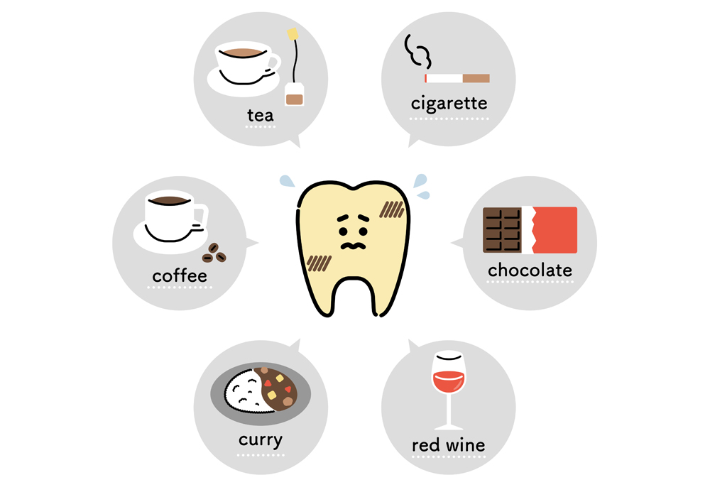 コーヒーや赤ワイン、カレーなどの色が濃い飲食物、そしてたばこのヤニなどが代表的です。これらの色素が歯に沈着し(ステイン)、黄ばみを引き起こします。